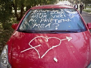 I saw this car in the Opera parking, where all students of the Law Faculty park their cars. The writing was done with whipped cream, so maybe the author was trying to add an extra layer of depth to his declaration…The whipped cream was also a good practical idea because it’s non destructive. However, some two hours later the windshield looked like the owner did not have windshield liquid in the tank 🙂