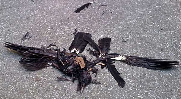 I found this on an alley near work, under a tree. However I cannot understand how it happened: it looks like the bird fell off the tree :-O or like it ingested a grenade… Or maybe a car ran it over at 5kmph (it’s a pedestrian alley that leads to abuilding entrance).