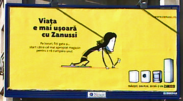 I swear to you this picture is TAKEN not MADE: The add says ‘Life is easier with Zanussi. on your mark, get set, start to the closest shop’. The woman is in a block start position. However, the sun was at the perfect angle when I passed by to have night lights’ shadow look like a dog collar around the woman’s neck and make her look submitted, enslaved 🙂